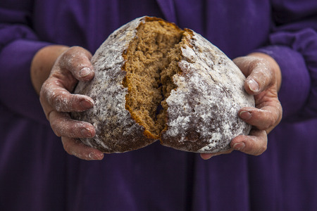 A man holds a chopped loaf of bread in his hands. In open palms are pieces of bread. The concept of mercy and help to those in need. Charity. Focus in the foreground. Close-up.