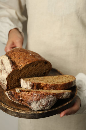 Homemade Bread on a wooden tray in the hands of a woman baker