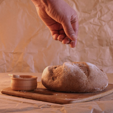 Whole grain bread put on kitchen wood plate with a chef holding gold knife for cut. Fresh bread on table close-up. Fresh bread on the kitchen table The healthy eating and traditional bakery concept