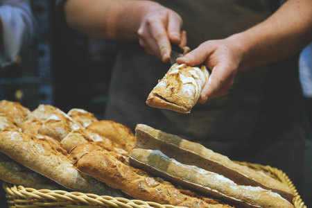Hand-slicing craft bread on a table in a local Portuguese bakery. The healthy eating and traditional bakery concept. Close up. Part of the series.
