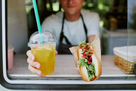 Medium close up of fresh made citrus lemonade and fresh cooked hot dog in hands of unrecognizable chef