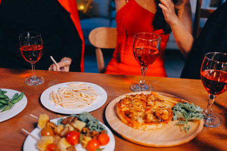 Group of diverse friends having dinner and a glass of wine al fr