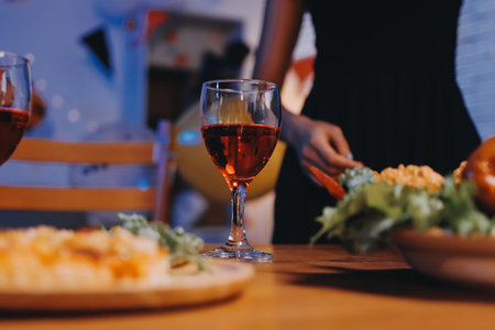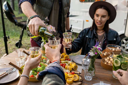 Hand of young man pouring wine into glass of friend over table served with homemade food