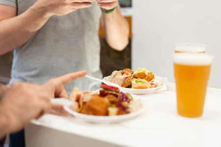 Beer and small buffet bites in plates on table food and drink concept.