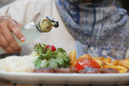 Water being poured into a glass on a table with a salad and sandwich, in close-up. Water pouring from a bottle onto fresh water in a restaurant or home dining room during mealtime. Close-up of hands pouring clean, clear, sparkling water onto a plate. Achieve a healthy lifestyle concept. High-resolution photography. --ar 53:30 --v 6.1 Job ID: c7c861b0-35ba-438f-aed9-fe5dd83de492