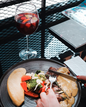 Good food and tasty red wine in a restaurant during lunch time