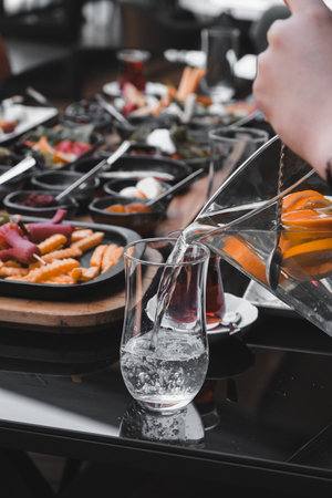 hands pouring water to glass at restaurant