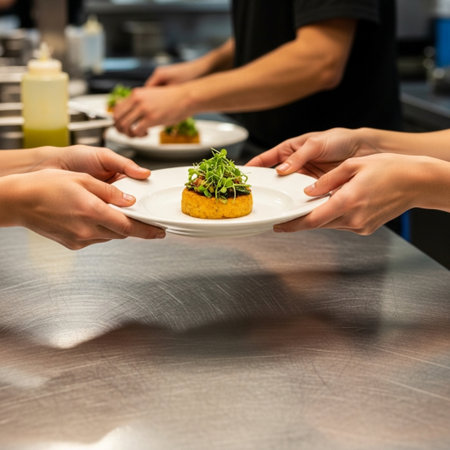 Close up of chef giving out finished dish at ordering station in open restaurant kitchen