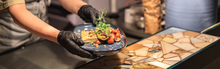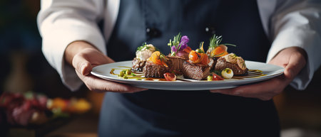 close-up on the hand of a waiter carrying food duck steak with caramelized vegetables. Food styling and restaurant meal serving.