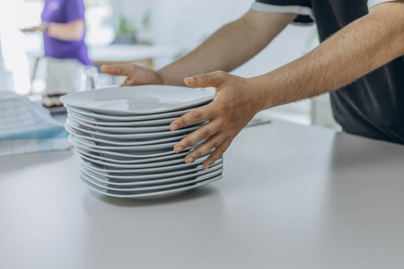 Close-up of hands holding a stack of white plates, ready to be set out for serving.