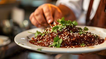Chef is garnishing dish with herbs, adding final touches to saucy, sesame-topped entree on white plate