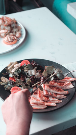 Lunch in a restaurant, a woman eat Tartar from scallop with avocado, cherry tomatoes, radishes and onion. Dish in the restaurant from raw seafood.