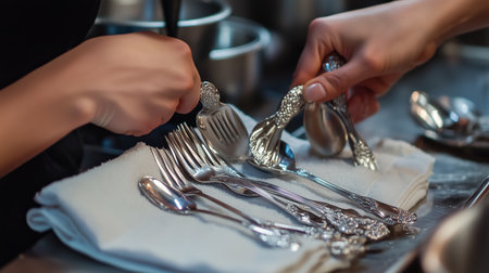 Person organizing a collection of various silver utensils on a cloth in a kitchen setting during the afternoon