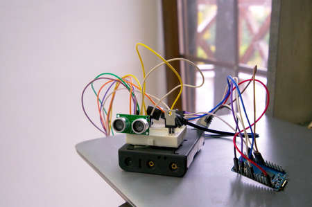 Electronic component connected with breadboard in laboratory. electrical engineering with cables and controller. Modern technologies, electronics, diy product engineering