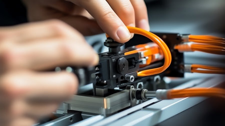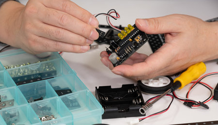 Robotics development closeup., electronic invention. Engineer, programmer, inventor hands with special cables, wires, working with breadboard and constructing robot at home. Modern technologies. Hobby