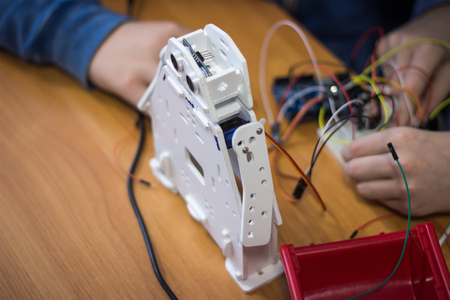 Close up of circuit board with wires and cables in robot engineering class or workshop activity