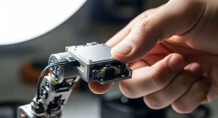 A macro close-up of an engineer's hand carefully assembling a small, complex robotic or electronic component. The part is metallic and has intricate details, wires, and circuits. This image represents precision engineering, robotics, and high-tech manufacturing.