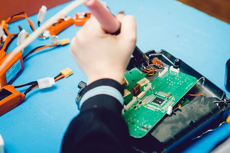 Airplane on the radio control. Repair, soldering iron in the hands of the guy.
