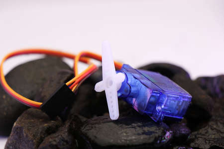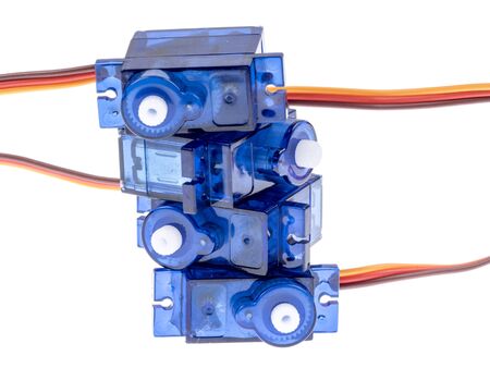 microelectronic servomotor on white background. component for control of robots and radio-controlled toys