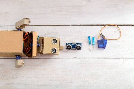 robot screwdrivers and servomotrchiki on a wooden white table. View from above