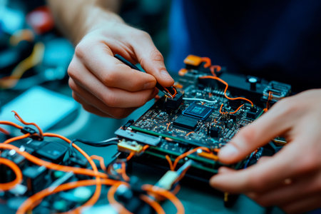 In a tech workshop, a skilled person assembles a complex circuit board, connecting wires and ensuring proper placement of components in the afternoon light.