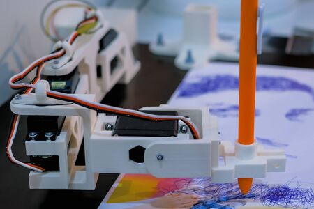Programmed robotic white manipulator arm with orange pen drawing portrait sketch on paper at robot futuristic exhibition - close up view. Future, art, sci-fi, automated technology equipment concept