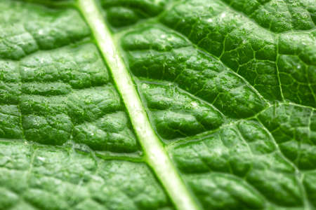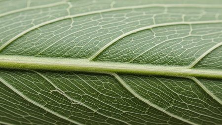 Extreme close-up of a vibrant green leaf reveals its intricate network of veins. Clear details and vibrant col...