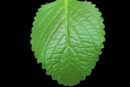 A single fresh mint leaf is beautifully displayed against a light background, highlighting its vibrant green color and intricate surface texture, ideal for culinary use or herbal remedies.