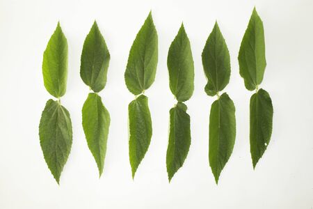 Green leaves on white background. Flat lay, top view. Nature concept.