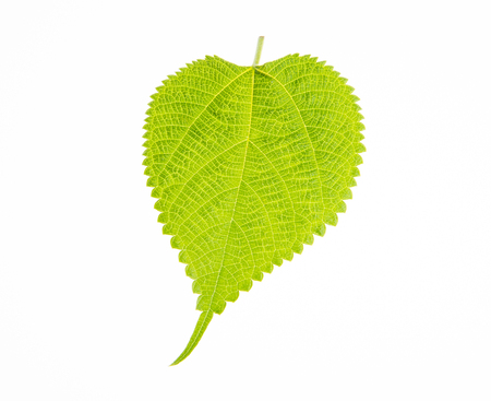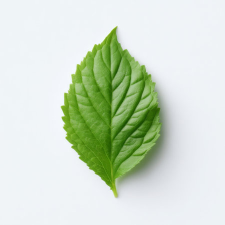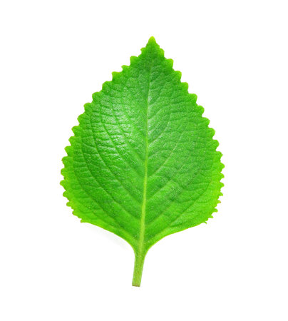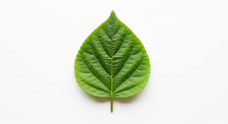 A fresh green leaf with intricate veins and a vibrant appearance, set against a clean white background, perfect for themes of nature and wellness.