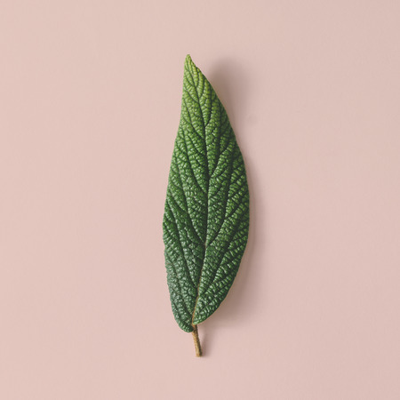 Beautiful green leaf on pastel background. Minimal nature concept. Flat lay.