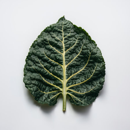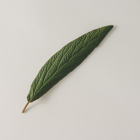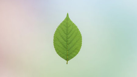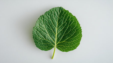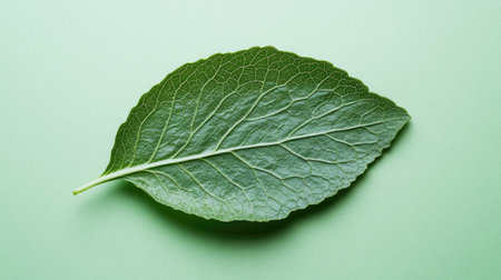 A single vibrant green leaf with intricate veins is placed on a light background, symbolizing nature's beauty and simplicity, ideal for various themes.