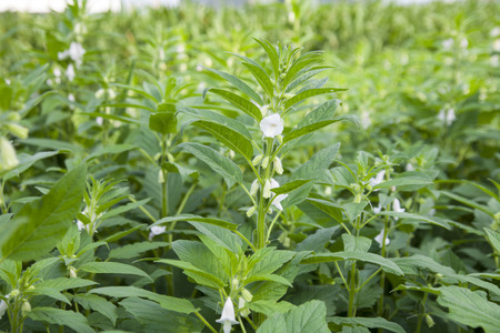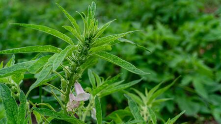 Sesame flower and seeds on tree. (Sesamum indicum plant).