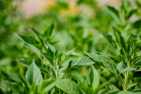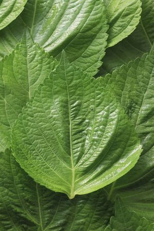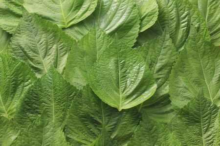 Close-up of organic green leaf perilla frutescens seedlings in field at summer. Herb vegetable plants growth in garden for healthy food use. banner with background