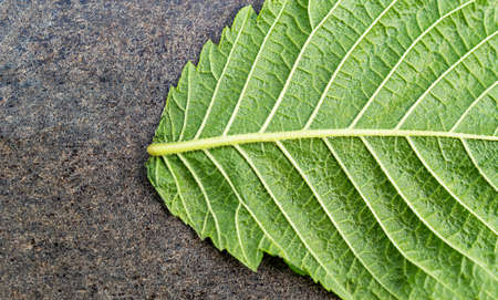 A vibrant green leaf is shown lying flat on a smooth, neutral background, highlighting its detailed surface texture and natural coloration. The leaf features prominent veins and a healthy appearance.