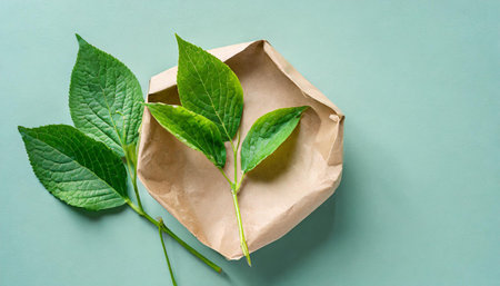 Eco, zero waste, plastic free and saving energy minimal concept from sprout with green leaves growing from recycled craft paper top view.