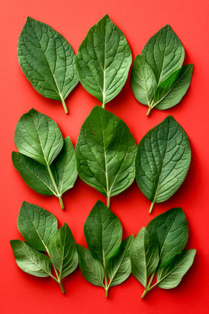 Fresh Green Basil Leaves Arranged Symmetrically on a Bold Red Background, Textured Herbal Foliage, Culinary Ingredients, Vibrant Food Photography, Minimalist Background for Advertisement or Design AI Generative