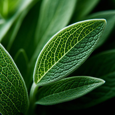 the sage plant leaf, with its delicate organic contours, is showcased in stunning detail in this ultra-high-definition image, evoking a sense of environmentalism and tactile connection to nature, reminiscent of a national geographic photo, perfect for those who appreciate the beauty of the natural world. ai generated