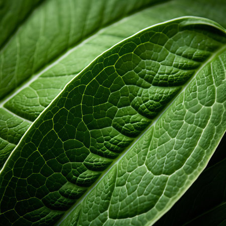 Stunning Close-Up of Vibrant Green Leaves with Intricate Veins on a Dark Background, Nature s Beauty