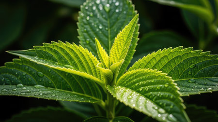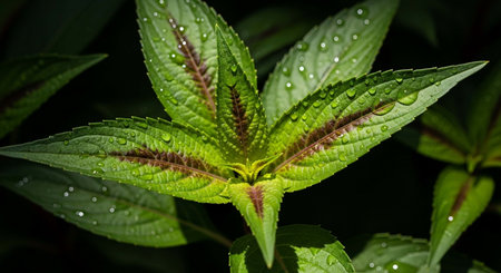 This image showcases a detailed view of lush green plant leaves covered in water droplets. The composition emphasizes the fresh, natural colors and textures of the foliage. The scene is illuminated with soft lighting, suggesting an outdoor environment. Suitable for a variety of commercial and editorial uses.