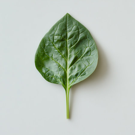 A single fresh spinach leaf rests on a plain background, highlighting its soft green color and intricate textures under natural light. The leaf symbolizes healthy eating and freshness.