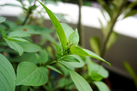 Close up view of real Basil Leaves herb plant for home gardening and food photo