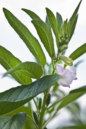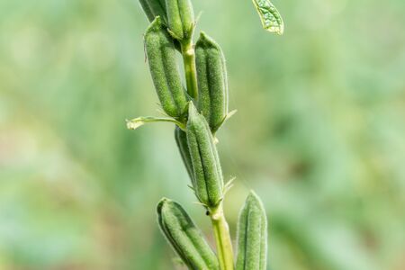 Green sesame plant blooming in field and bud