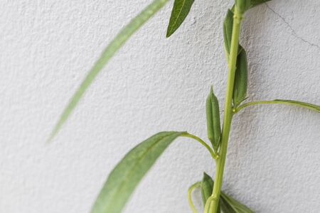Okra plant with little okras on it getting ready for harvesting close up view