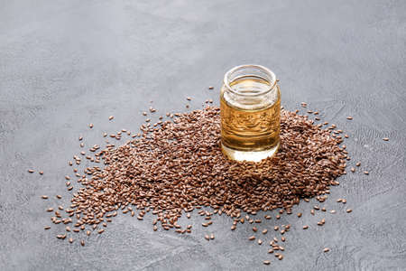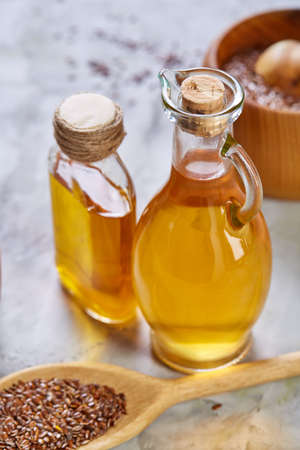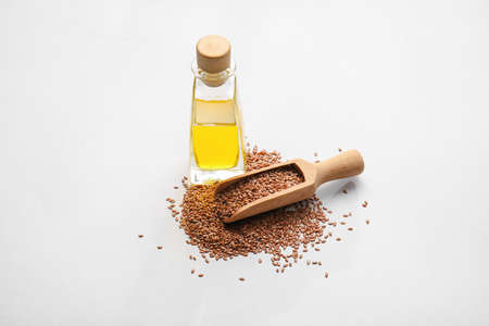 Flax seeds in bowl and flaxseed oil in glass bottle on light textured background, top view, close-up, selective focus