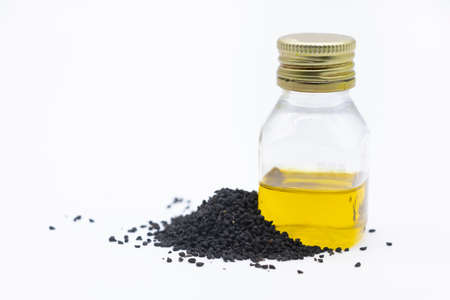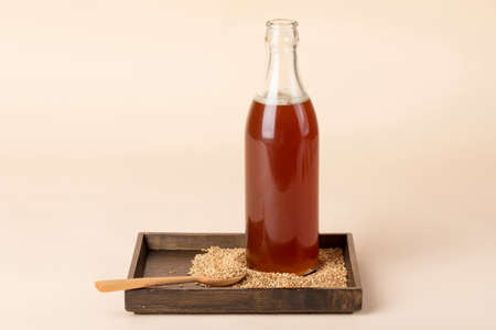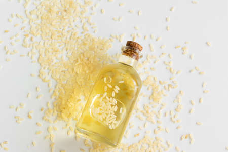 Sesame essence oil in bottle with sesame seeds for food or cosmetic products