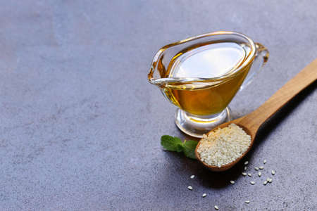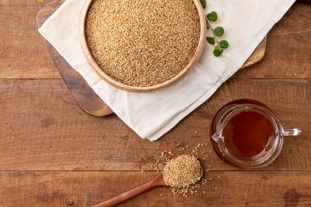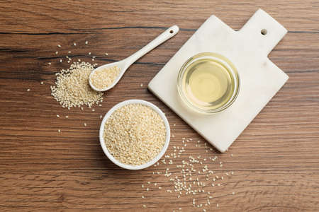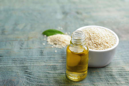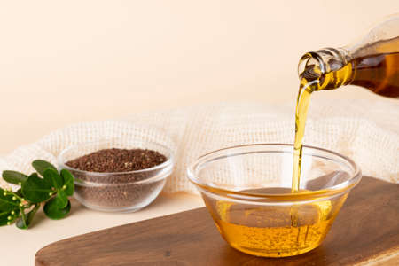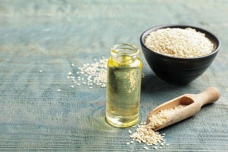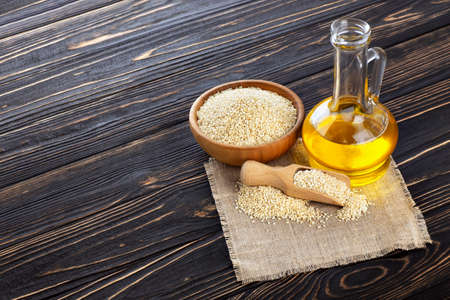 Natural vegetable oil from sesame seeds in a clear bowl on the wooden background. Dietary healthy food. Top view and copy space