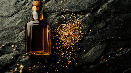 A dark glass bottle filled with oil, surrounded by seeds on a textured stone surface. Ideal for showcasing natural ingredients in culinary art.