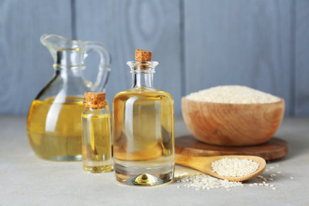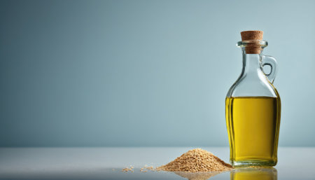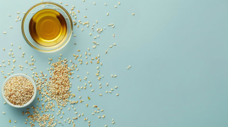 A visually appealing composition featuring fresh sesame oil and scattered seed on a soft blue background, ideal for promoting healthy cooking and culinary recipes.