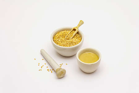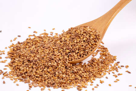 Sesame seed in jar on white background. Isolated yellow sesame seeds spread on table. Nutrition food